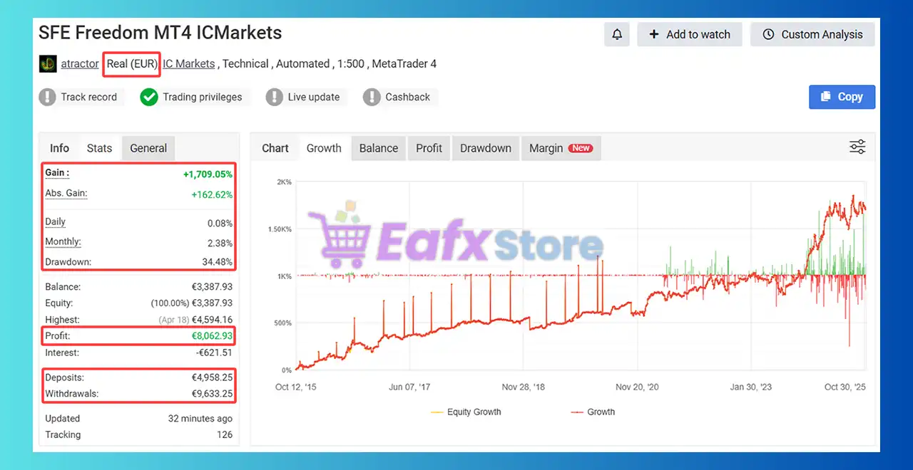 The SFE Freedom EA has demonstrated extraordinary trading performance on a verified Myfxbook account. Below is a breakdown of the key metrics and what they reveal about the Expert Advisor (EA):