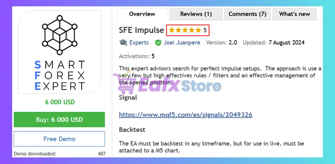 This product is compiled by Joel Juanpere. This author has more than +11 years of experience working on MQL5 with many famous products such as SFE Impulse MT5, SFE Impulse MT4, SFE Swing EA MT5, SFE Raw Impulse MT5 and other advisors. Among them, SFE Impulse MT5 is his best performing product.
