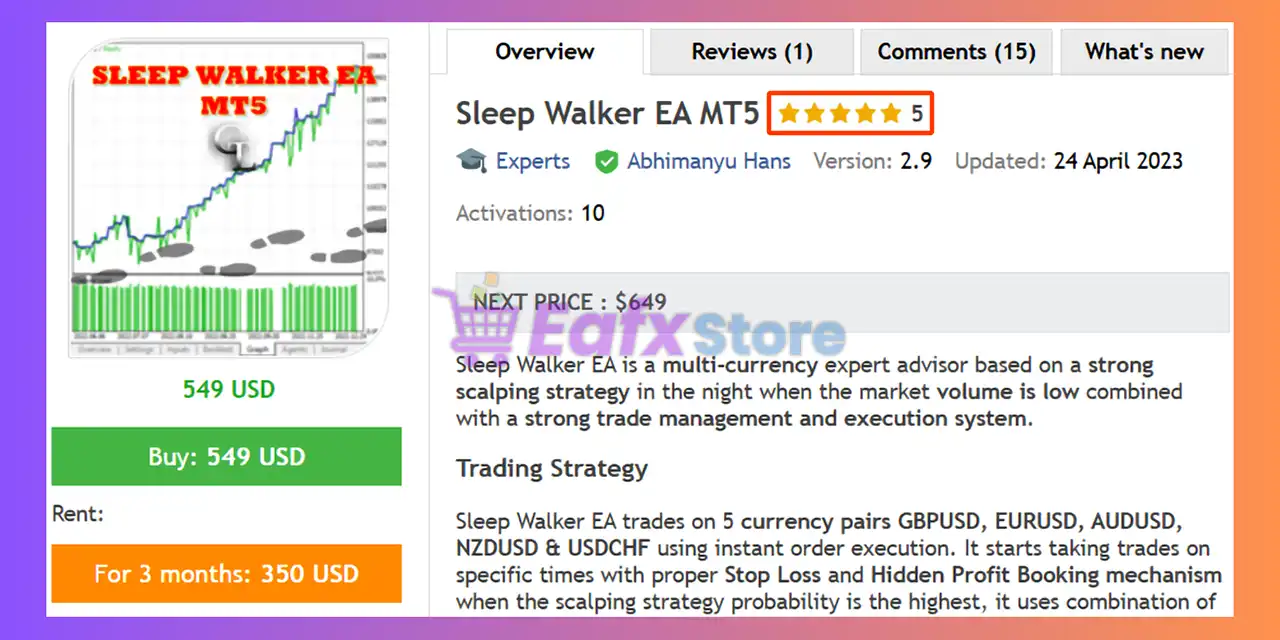 This product is compiled by Abhimanyu Hans. This India author has more than +7 years of experience working on MQL5 with many famous products such as Sleep Walker EA MT5, The Infinity EA MT5, The Infinity EA MT4Martini EA MT4, W Drive Forex AI EA Pro MT5 and others. Among them, Sleep Walker EA MT5 is his best performing product.