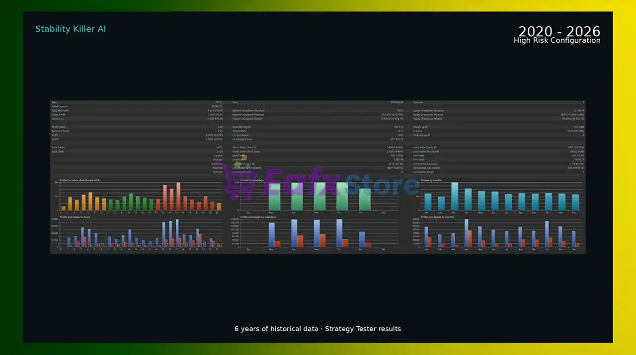 Stability Killer AI MT5 applies professional risk controls, low drawdown limits, and AI validation to protect capital during volatile market phases.
