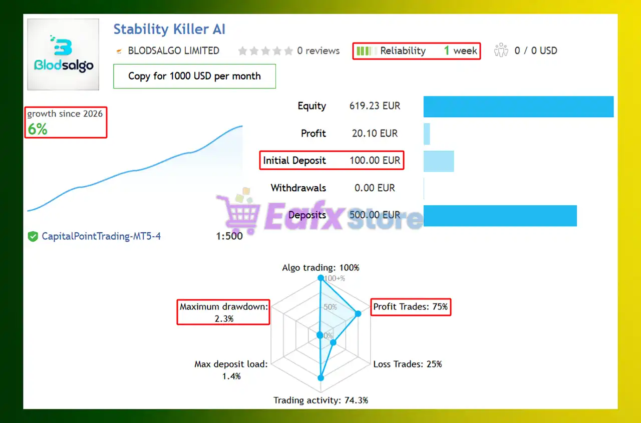 Stability Killer AI MT5 can operate from moderate deposits and is designed to grow accounts steadily with low drawdown exposure.