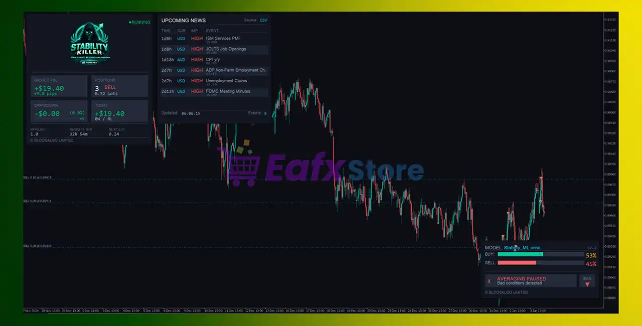 Stability Killer AI MT5 includes advanced news filtering to avoid unstable periods and protect the account from unexpected volatility.