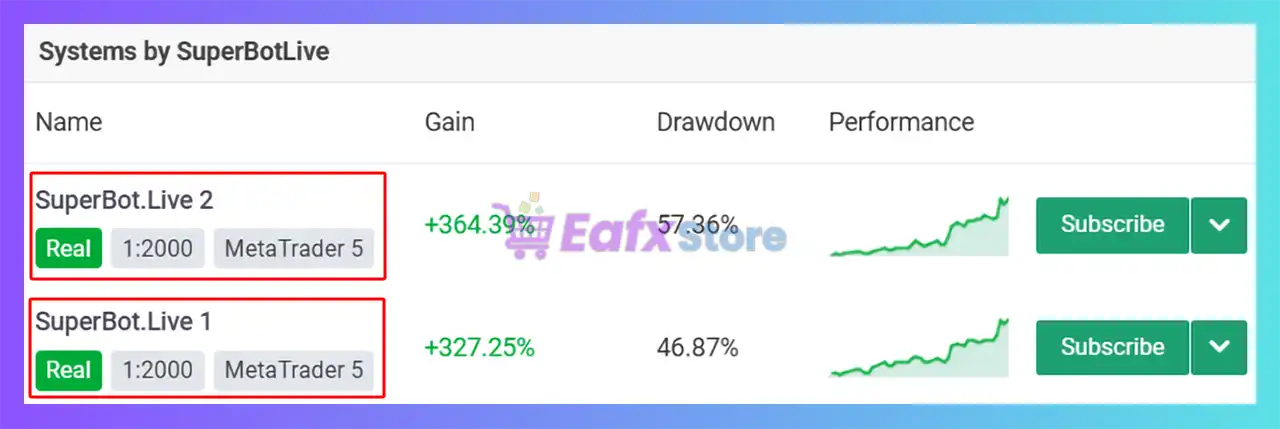 SuperBot Live MT5 requires a minimum deposit of $300, allowing better stability and efficiency in automated trading conditions.