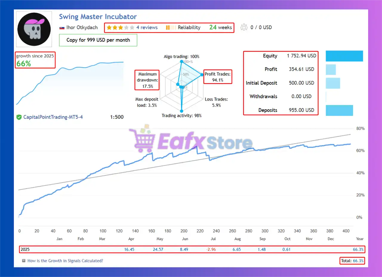 In short, Swing Master EA is a powerful, fully automated Expert Advisor that transforms the proven Algo Pumping manual strategy into a high-performance trading robot. Designed by seasoned MQL5 developer Ihor Otkydach, this EA delivers consistent profitability without relying on risky grid or martingale techniques.