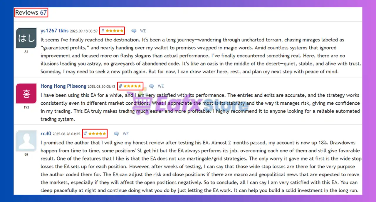 ➡️ Stephen J Martret (2025.05.16): “Excellent EA, very safe and profitable!! Highly recommended if you want to grow your account for many years to come, this is not an EA that will make you 10% in a week then blow your account, its real trading, low risk but safe and profitable.”