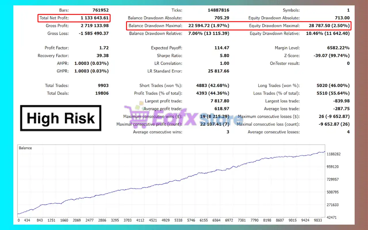 🔶 The Bitcoin Core EA backtest trading results achieved impressive profit performance for 7 years on the BTCUSD. Performance when using the HIGH RISK strategy: