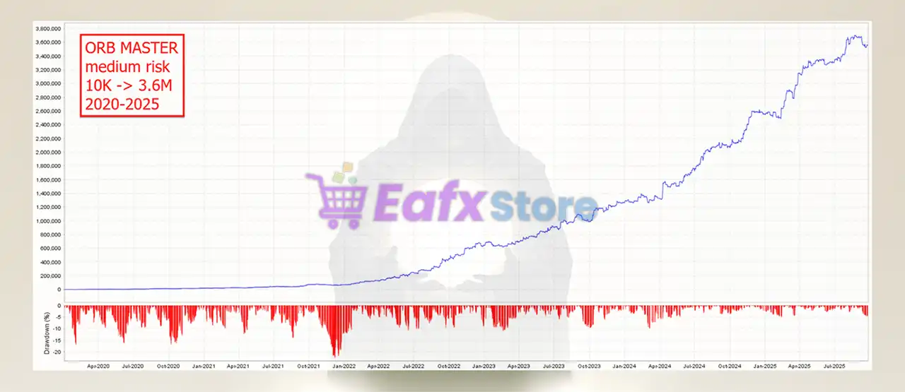 🔹The ORB Master MT5 backtest trading results for 5 years (2020 – 2025) achieved high profit performance using MEDIUM RISK trading strategy.