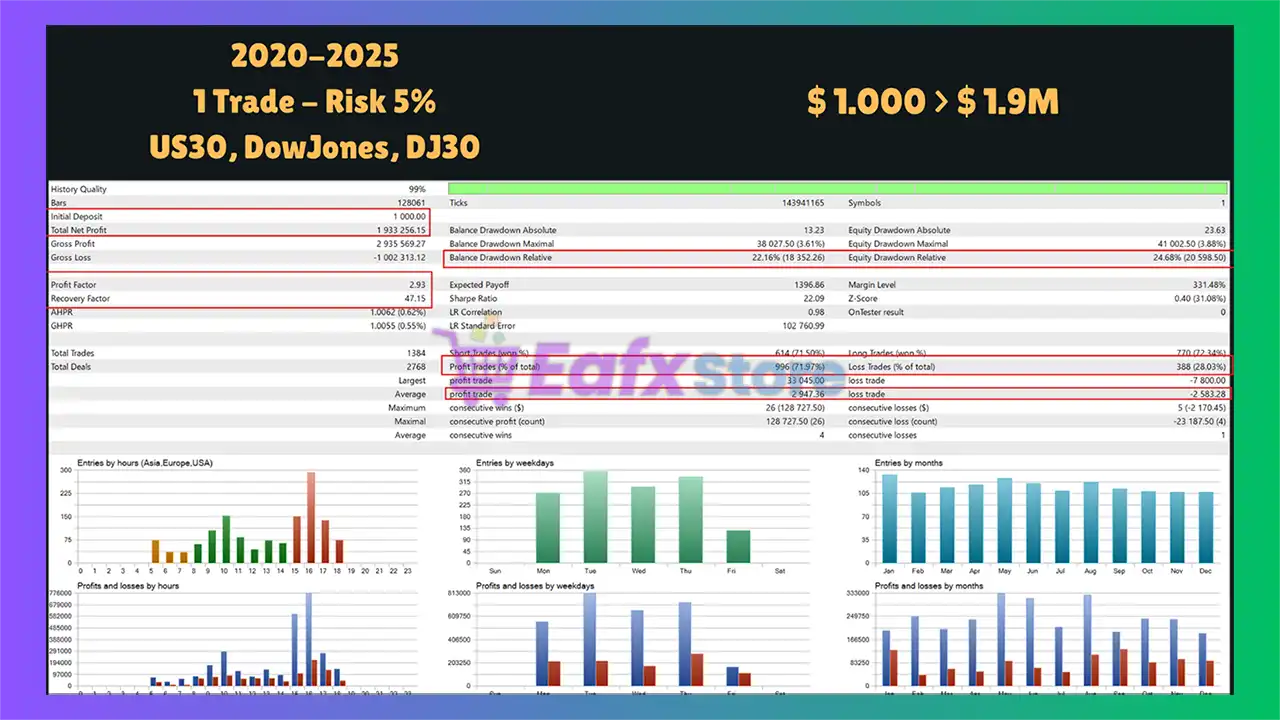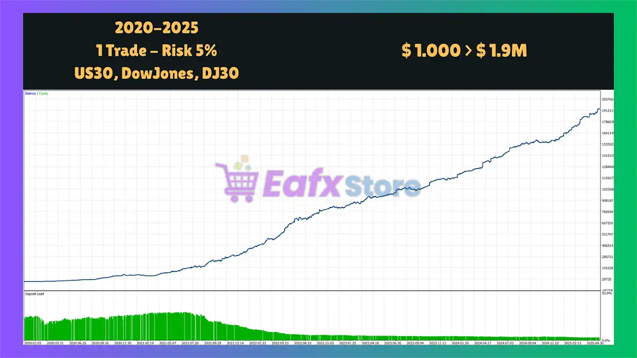 Over 5 years, it delivered $1.93M profit from $1,000 on US30 with a 71.95% win rate and only 3.61% drawdown.