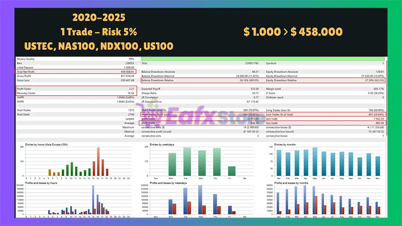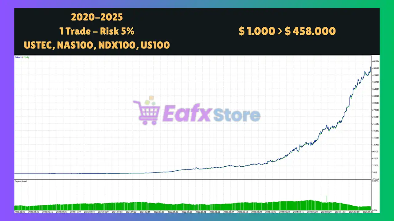 🔹The Titan Breaker MT4 has been tested over a 5-year backtest period (2020–2025) on USTEC, NAS100, NDX100, and US100 indices with a 5% risk per trade.