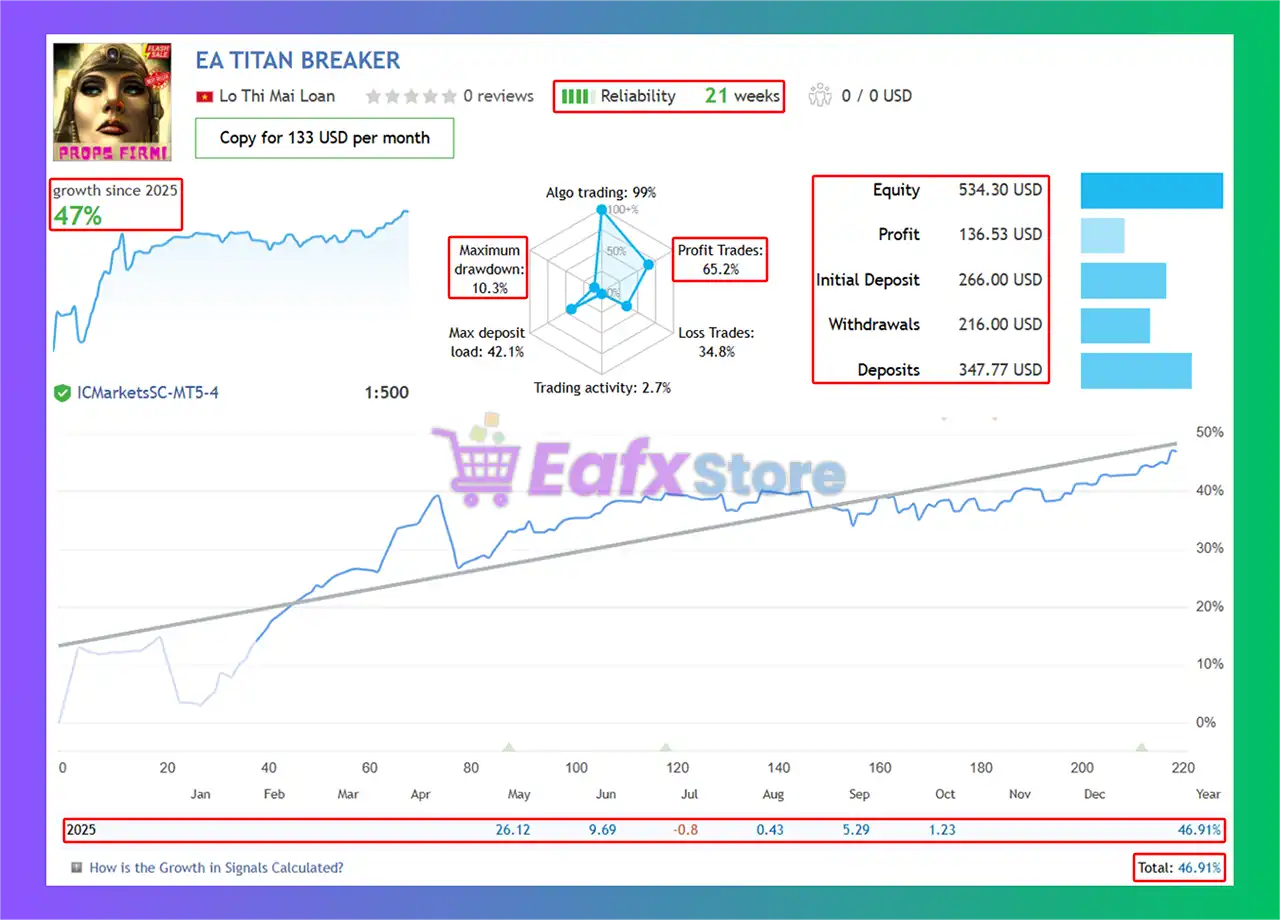 Titan Breaker EA has shown strong performance on Real accounts over 21 weeks of trading, confirming its potential to become a reliable forex trading solution for both self-employed companies and individual investors.