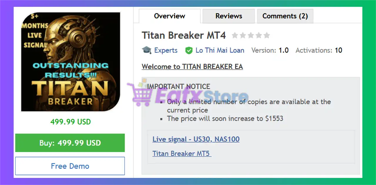This product is compiled by Lo Thi Mai Loan. This author has more than +2 years of experience working on MQL5 with many famous products such as Titan Breaker MT4, EA Forex Scalper MT4, Bitcoin Scalping MT4, Gold Trend Scalping MT4, Gold ISIS MT4 and other advisors. Among them, Titan Breaker MT4 is his best performing product.