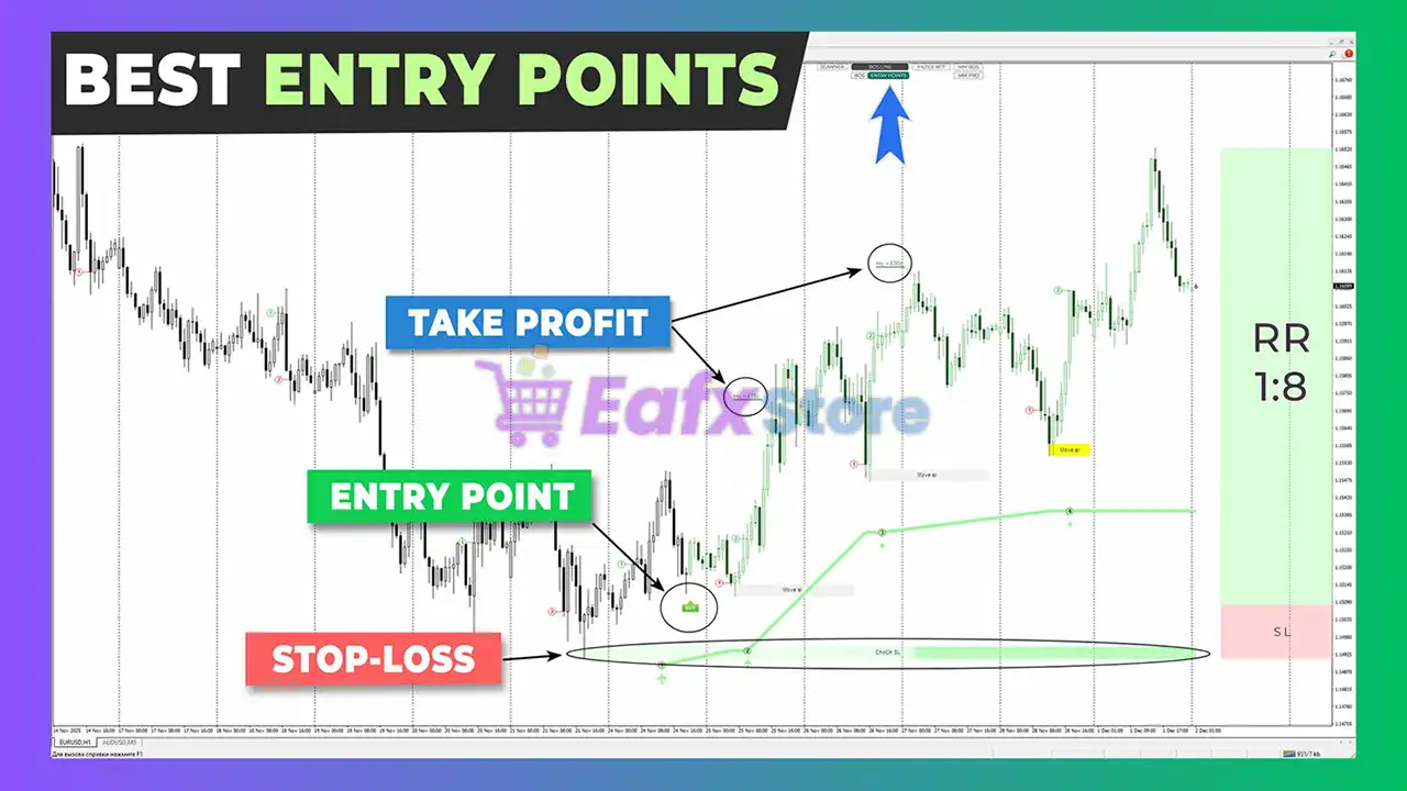 The indicator highlights specific color-coded areas on your chart. When the price retraces into these Visual Entry Zones after a confirmed BOS, it presents a high-probability opportunity to enter a trade with a tight stop loss.