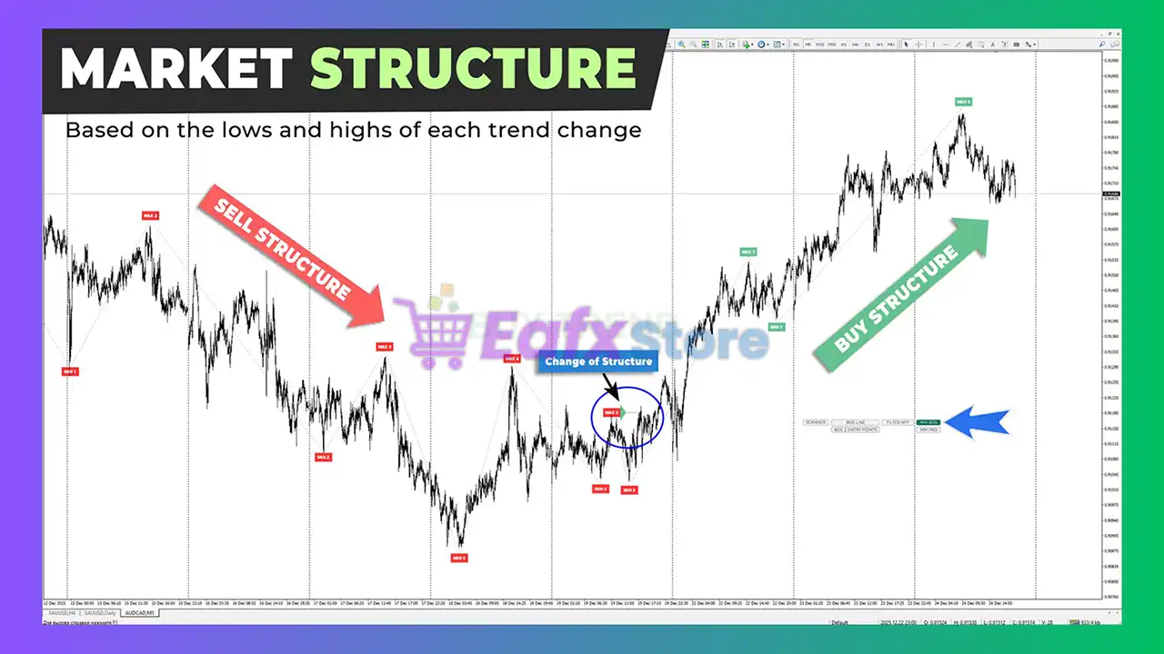 🔹 Market Structure Mapping: Clearly displays highs, lows and current trend direction.