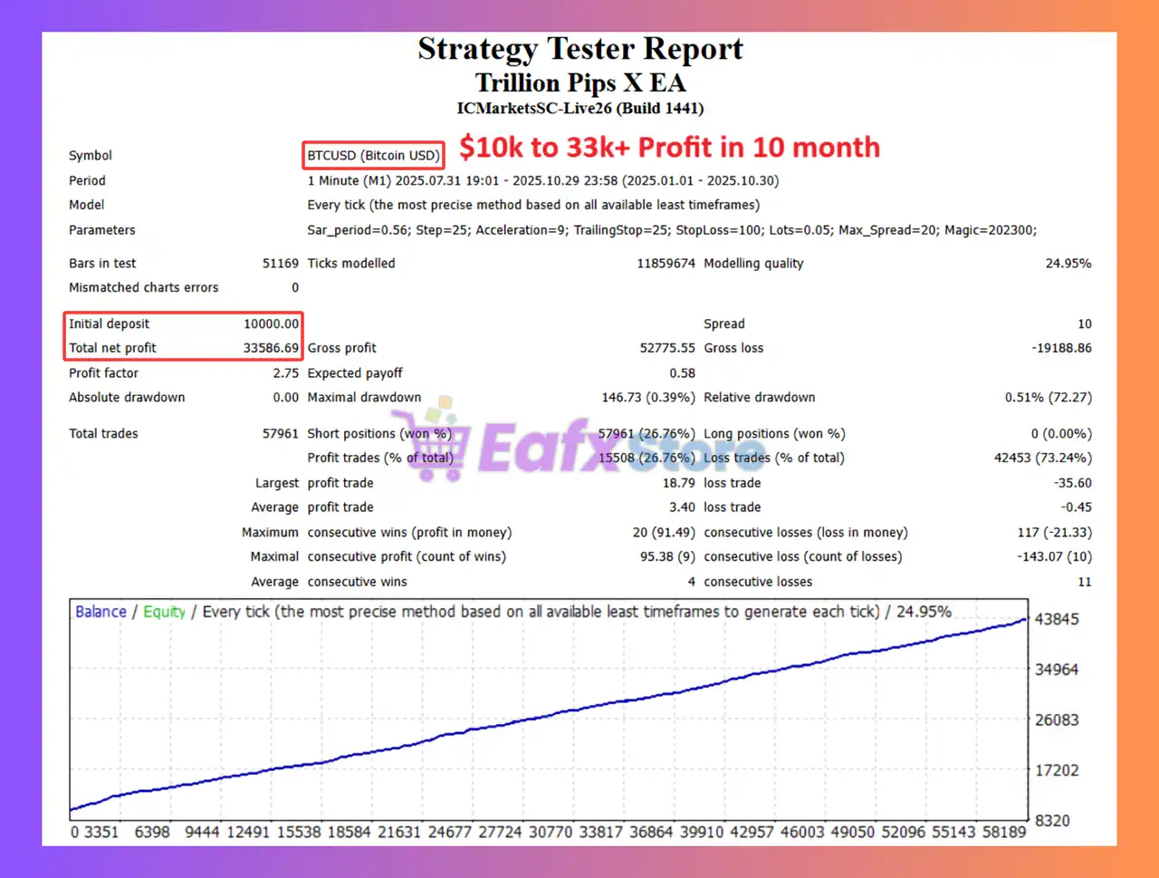 🧩 The Trillion Pips X EA backtest trading results achieved impressive profit performance for 10 months on the BTCUSD (Bitcoin) pair.