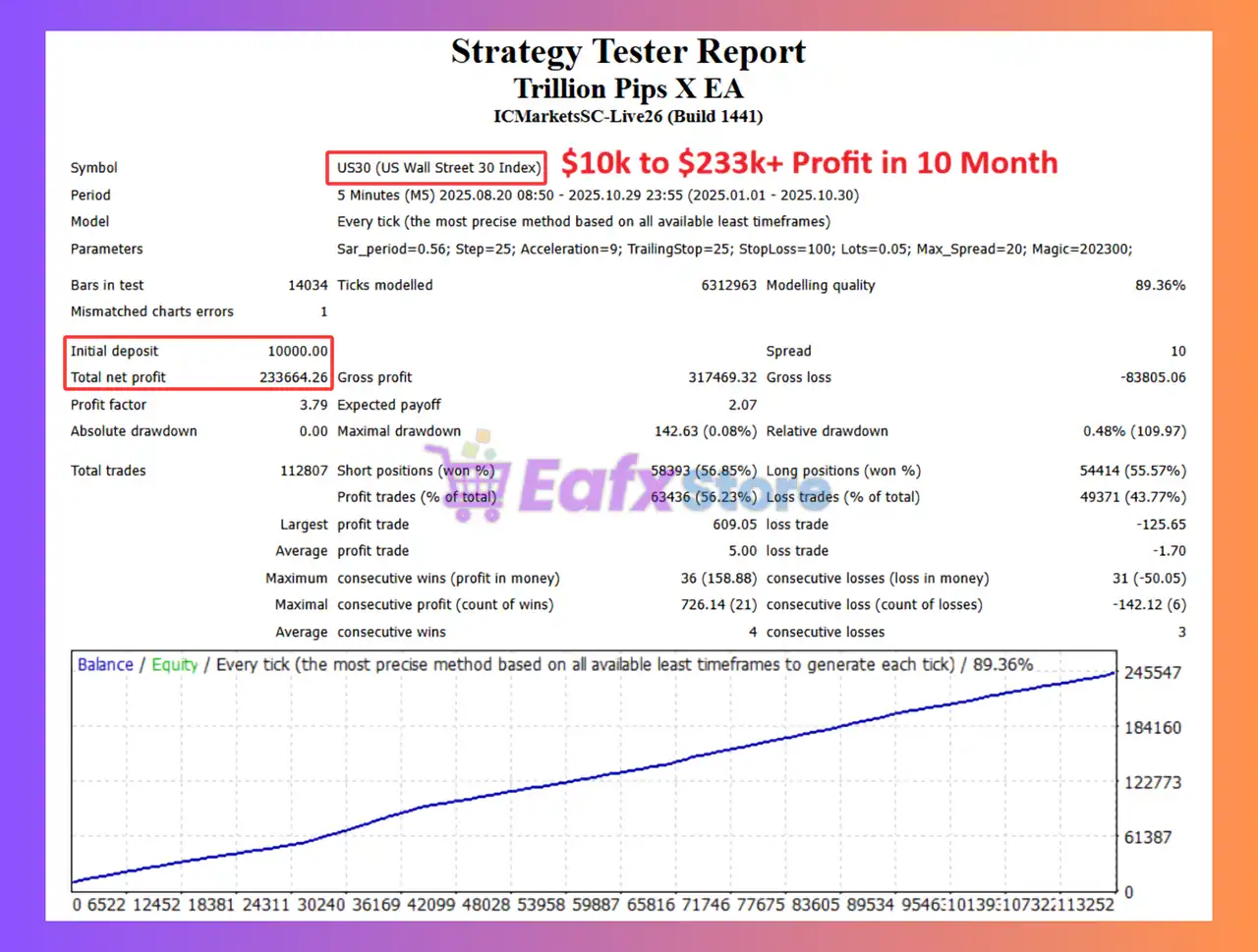 🧩 The Trillion Pips X EA backtest trading results achieved impressive profit performance for 10 months on the US30 pair. The advisor showed the ability to maintain safe stars on the 5-minute chart.