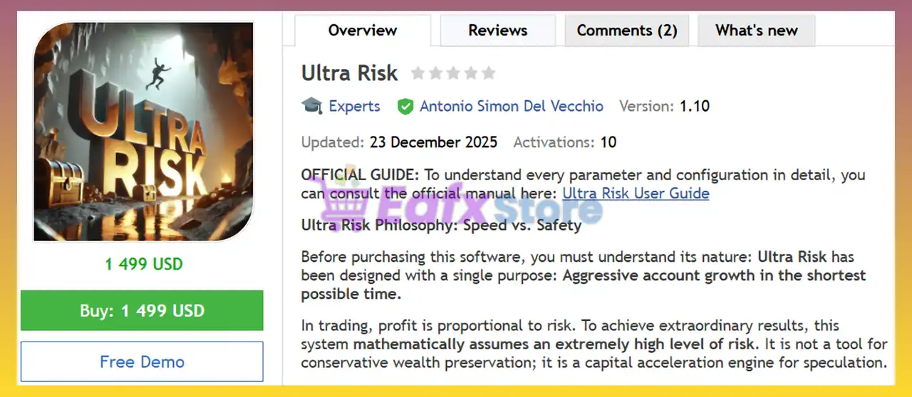 This product is compiled by Antonio Simon Del Vecchio. This author has more than +8 years of experience working on MQL5 with many famous products such as Ultra Risk EA MT5, Scalper Deriv EA MT5, Gold AI Robot MT5, Bitcoin MT5 Bot, Money Mind BTC MT5 and other advisors. Among them, Ultra Risk EA is his best performing products.