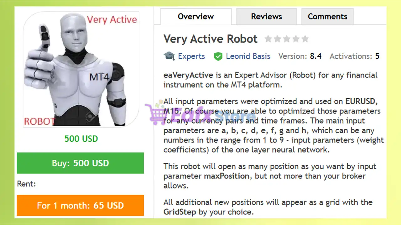 This product is compiled by Leonid Basis. This author has more than +13 years of experience working on MQL5 with many famous products such as Very Active Robot MT4, Schrodinger trading machine MT4, Complete Pending Orders Grid System MT4 and other advisors. Among them, Very Active Robot is his best performing product.