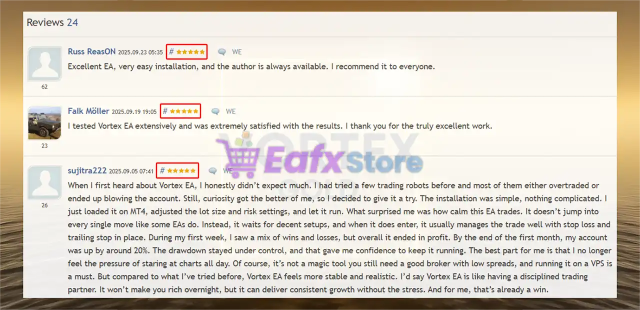 Vortex Gold EA demonstrates remarkable potential in delivering stable and reliable profits, making it a reliable tool in the forex market. Vortex Gold EA is highly regarded by the MQL5 community in many aspects and has gained the trust of its users.