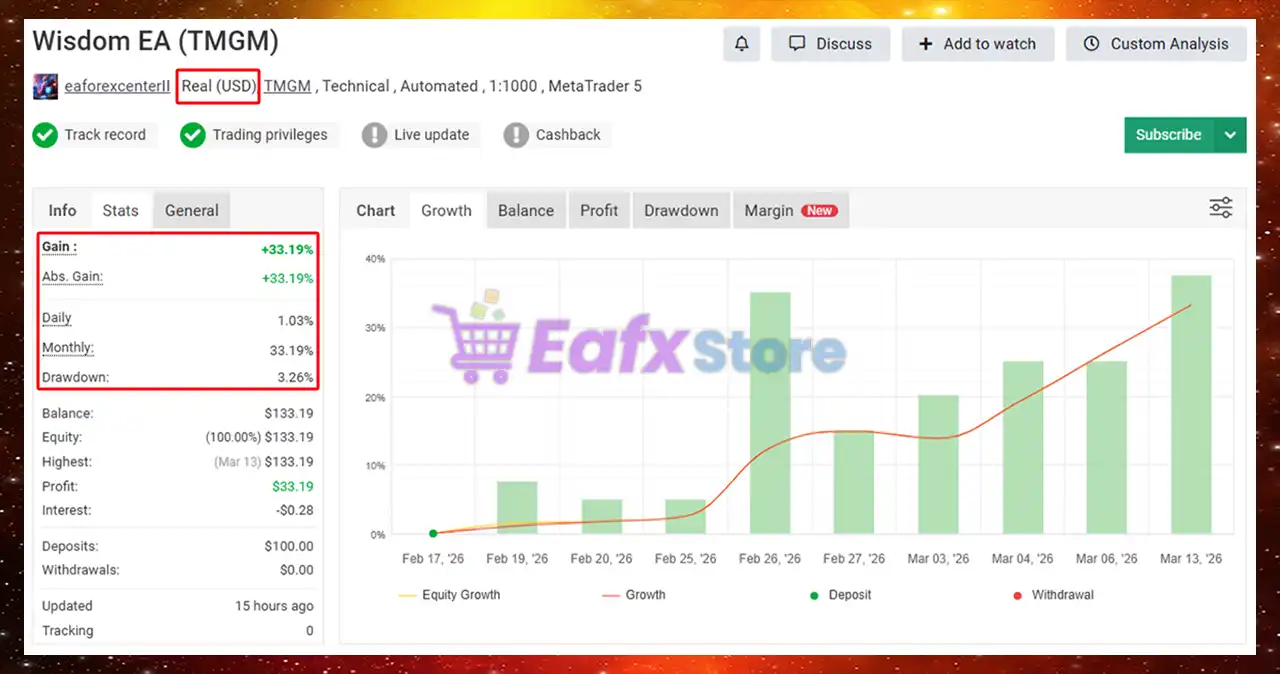 Wisdom EA has been verified profitable by MyFxBook in the long term and has achieved impressive returns. This consultant indicates good trading potential and high profit margins.