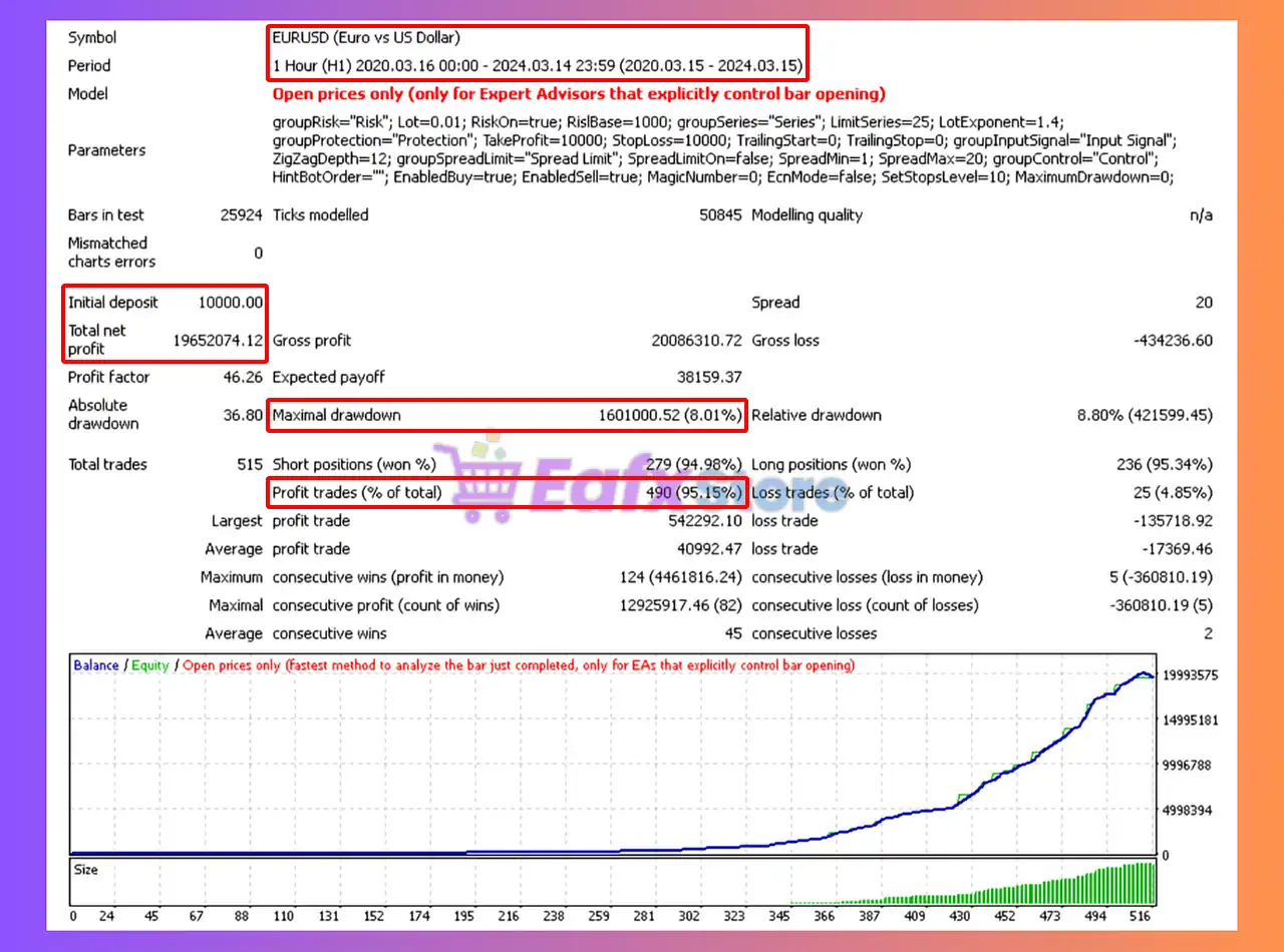 🔶 The Work Stations EA backtest trading results achieved impressive profit performance for 4 years on the EURUSD pair.