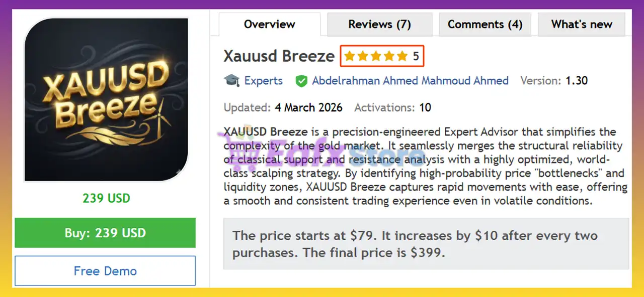 In short, XAUUSD Breeze EA stands out as a hybrid scalping and market structure trading system optimized for gold markets on MetaTrader 5. Its liquidity zone detection, volatility filters, and automated trade management help maintain precision and controlled exposure. Designed for stability in volatile XAUUSD conditions, this EA delivers a reliable framework for traders seeking disciplined automated gold trading.
