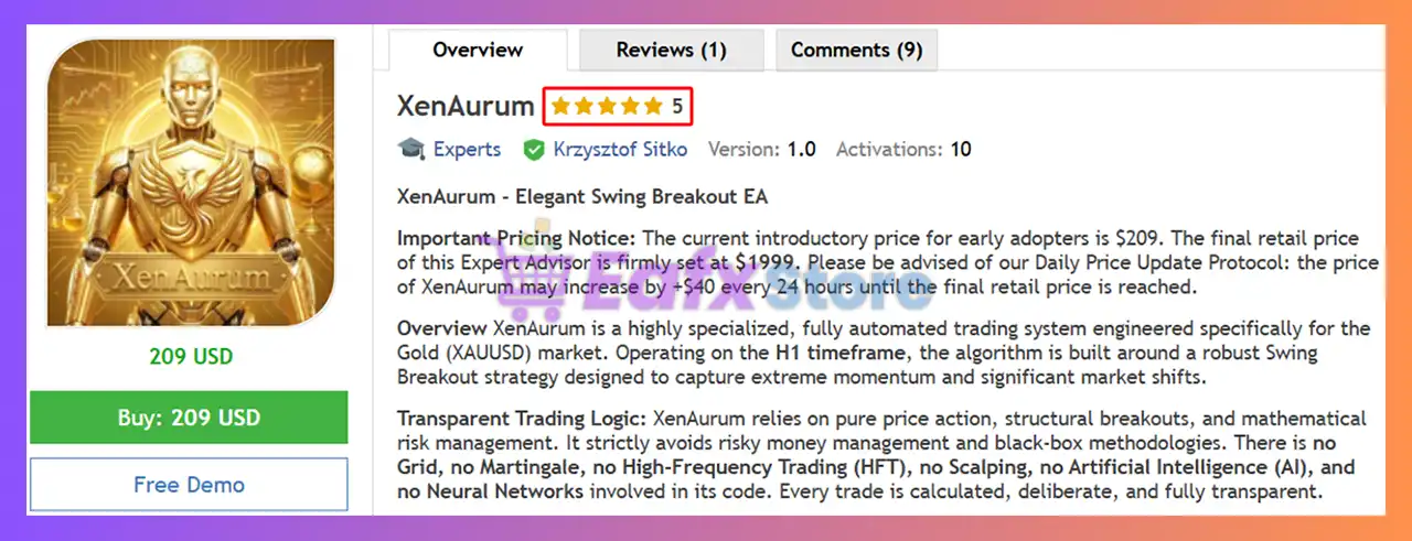 This product is compiled by Krzysztof Sitko. This author has more than +1 years of experience working on MQL5 with many famous products such as XenAurum EA MT5, VertexAlgo EA MT5, Dynamic Structure EA MT5, XenClarity EA MT5 and other advisors. Among them, XenAurum EA is his best performing products.