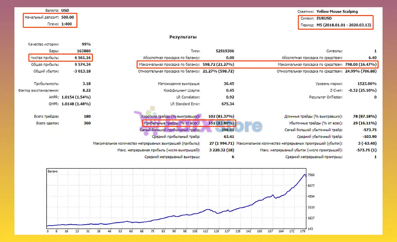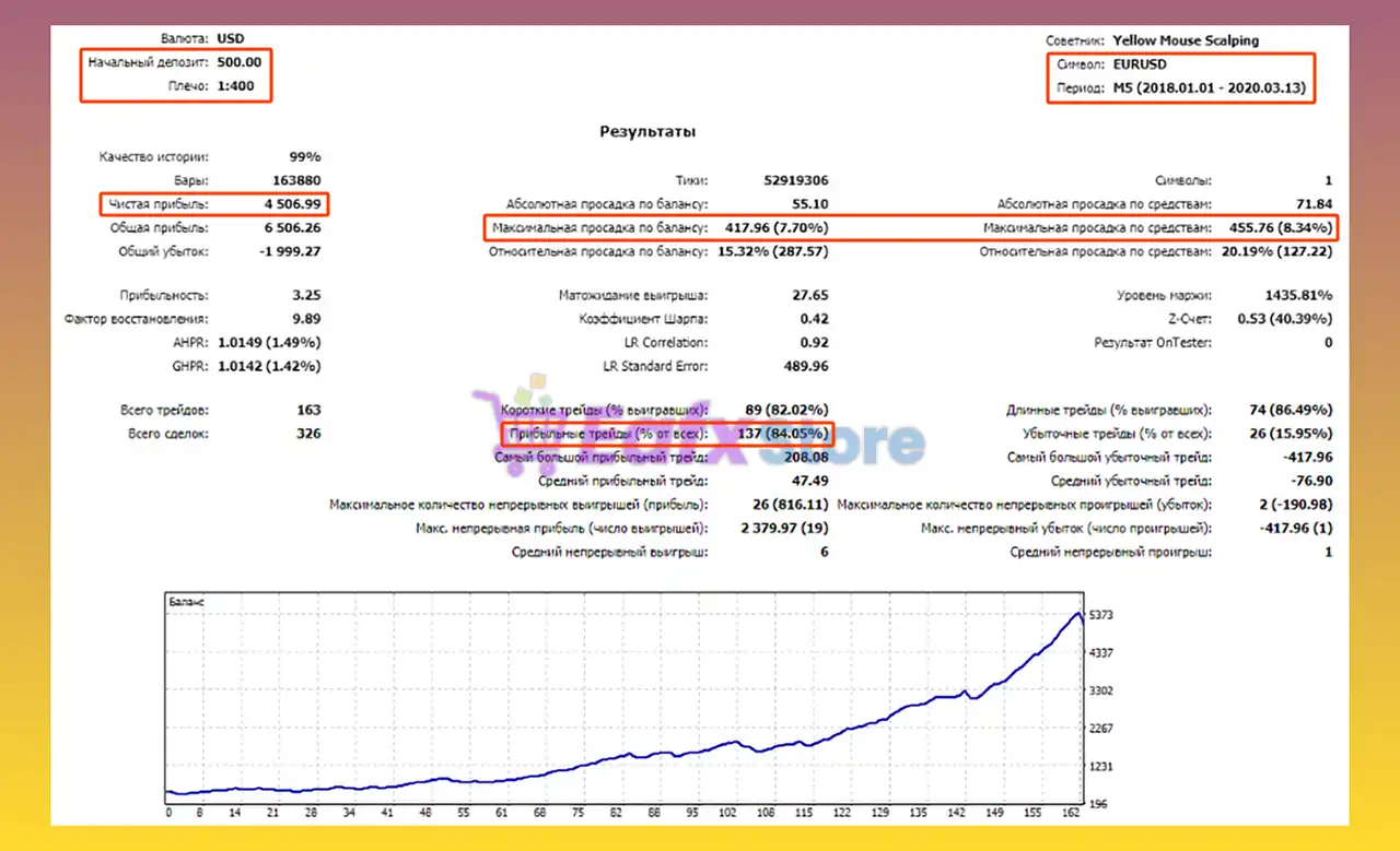 The recommended minimum deposit for Yellow mouse scalping MT5 is $100, depending on the selected risk settings.
